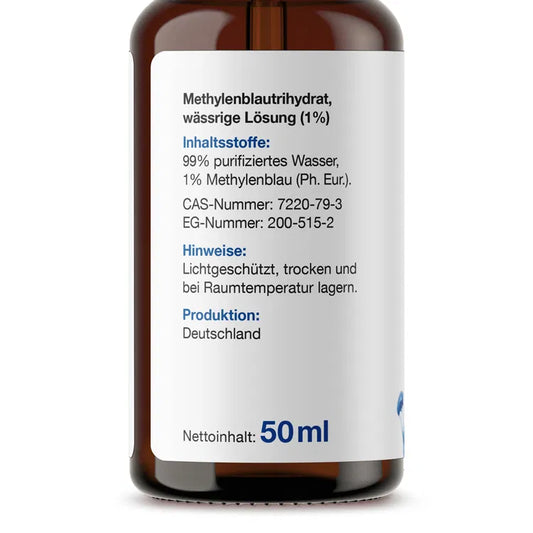Inhaltsstoffe: 99 % gereinigtes Wasser, 1 % Methylenblau Ph. Eur. (500 mg)